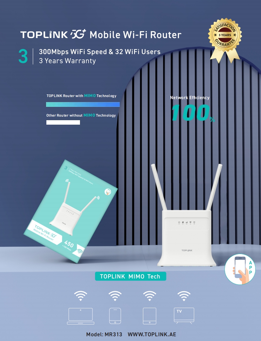 TOPLINK MR313 is a compact LTE Cat-4 indoor CPE router designed for stable 4G wireless broadband in homes,offices,and temote locations.